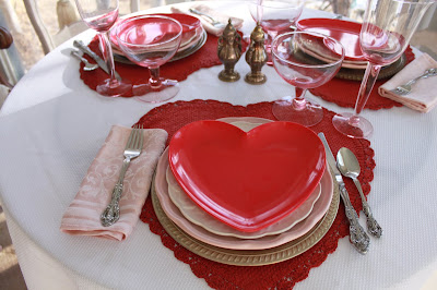 Red heart placemats, Grey dinner plates, pink Pfaltzgraff dishes, and white